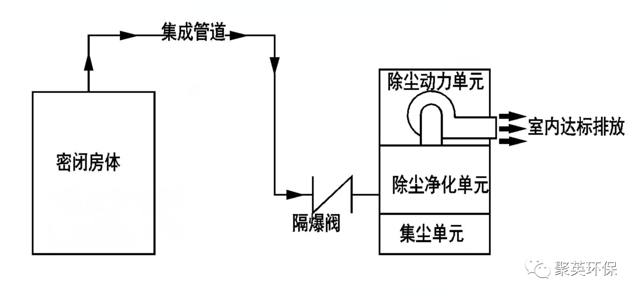 密閉房體 → 管道 → 防爆閥 → 除塵器 → 風機 → 煙囪(室內(nèi)達標排放)